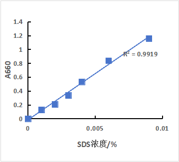 SDS残留检测试剂盒由0.1%SDS溶液、染色液和萃取液三部分组成,0.1%SDS溶液可用水稀释配制梯度SDS标准溶液绘制标曲,染色液可以选择性结合样品中的SDS形成复合物,这种复合物可被萃取液萃取到有机相中,再通过紫外分光光度法测定OD值;经测定该试剂盒在0.001%~0.01% SDS浓度范围内,线性拟合度较好,可达到0.99以上。