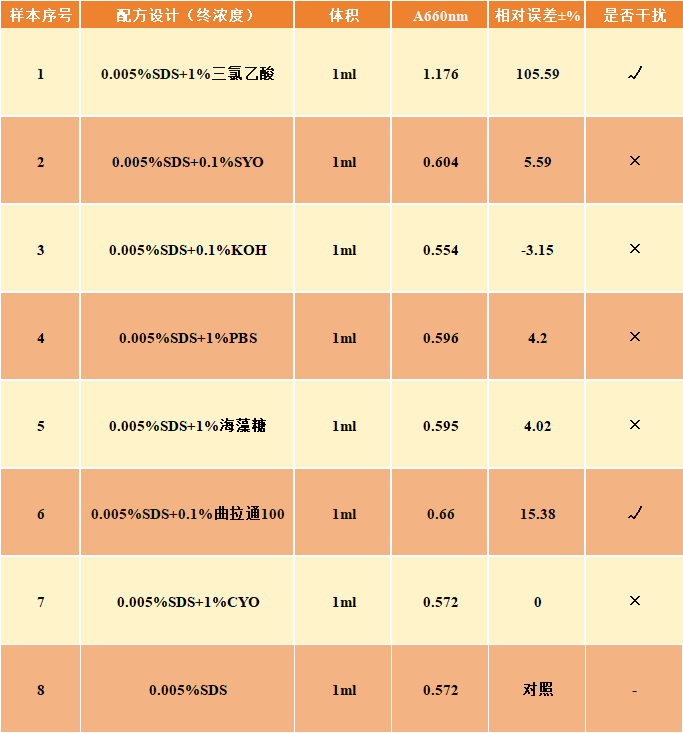 使用0.1%SDS用纯水稀释20倍得到0.005%SDS,然后分别加入可能影响吸光度值的干扰因素(三氯-乙酸、酸碱、缓冲盐、糖类、表面活性剂、醇类)。